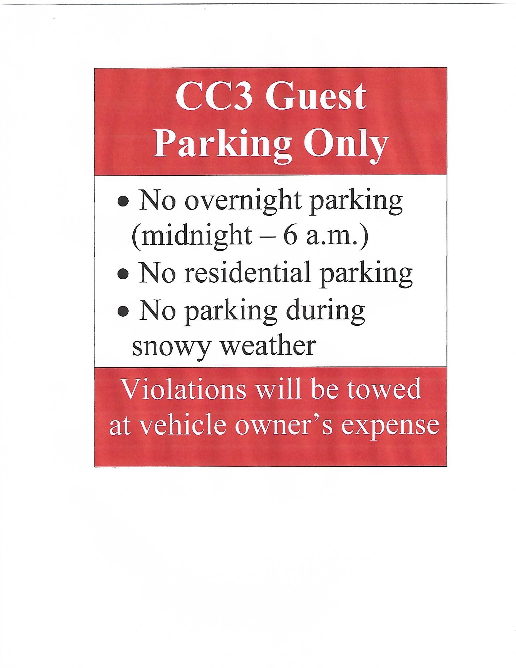 Effective immediately, overnight parking (between midnight and 6 a.m.) is prohibited in designated guest parking lots. The Board approved the overnight ban due to ongoing violations. If your guests need to park overnight, please do so where allowed on E. Nassau and E. Oxford. CC3 violations in guest lots will be towed without notice and at the vehicle owner's expense.